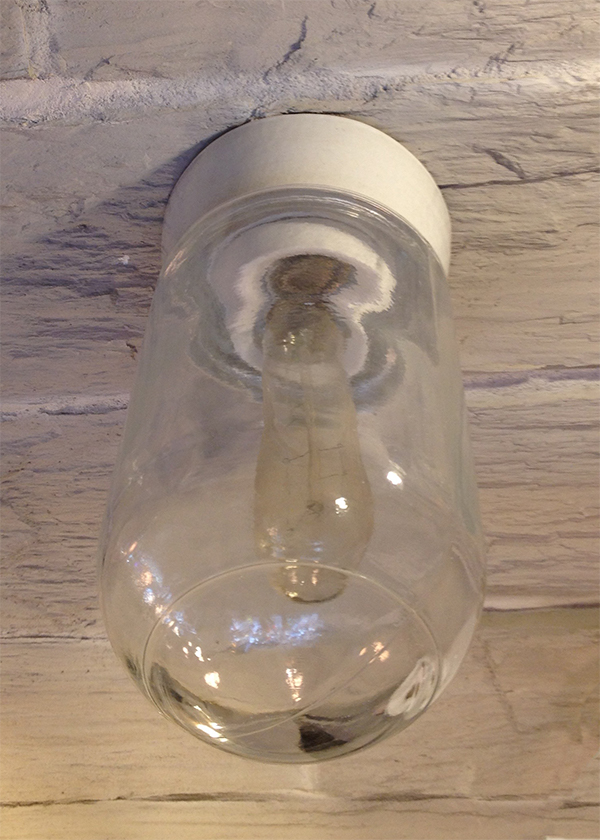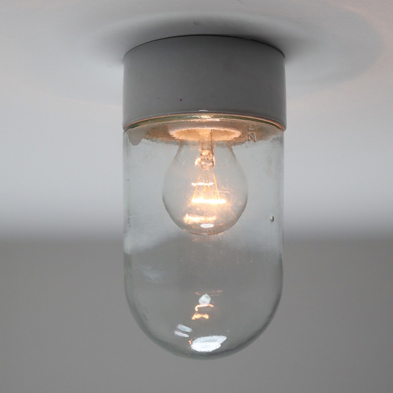 Strahler bestehend aus einer Porzellanbasis und einem aufgeschraubten Diffusor aus transparentem Glas. In Vintageoptik, er kann an der Wand als Strahler oder an der Decke als Deckenleuchte verwenden werden.