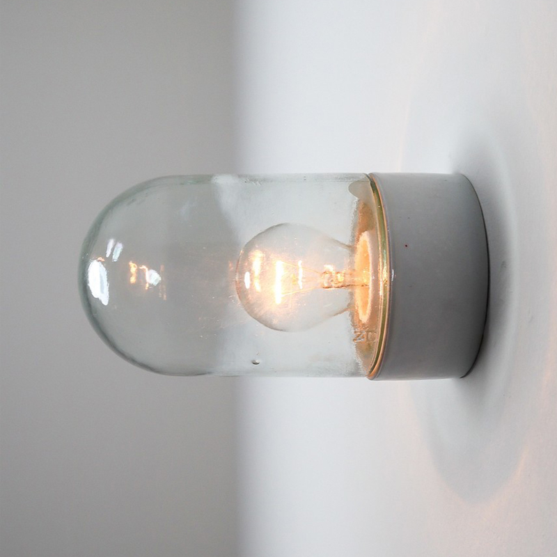 Strahler bestehend aus einer Porzellanbasis und einem aufgeschraubten Diffusor aus transparentem Glas. In Vintageoptik, er kann an der Wand als Strahler oder an der Decke als Deckenleuchte verwenden werden.