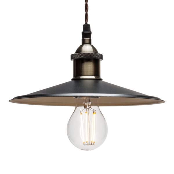 Decken-Hängeleuchte im Retrostil, 40er Jahre. Lampenfassung und Rosette in Oberfläche Bronze. Stromkabel geflochten mit Textilummantelung, Farbe braun, von 1m höhenverstellbar. Flacher Teller von reduzierten Abmessungen „Chinateller“, aus Metall schwarz Struktur und goldfarben matt in seinem Innern.