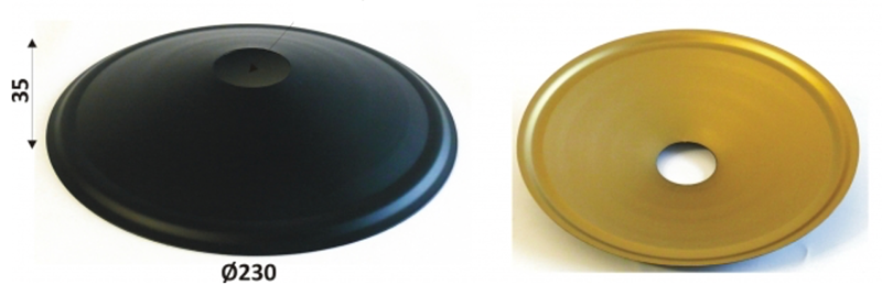 Abmessungen: Teller: d=230mm. Höhe=35mm. Deckenrosette: d=99mm. Höhe=24mm.