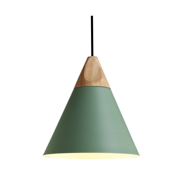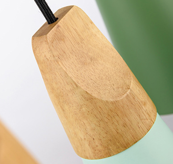 Decken-Hängeleuchte im nordischen Stil. Metallschirm in Farbe pastellgrün mit einem schönen Abschluss aus hellem Holz. Sein Inneres ist in weißer Farbe um die Beleuchtung zu verbessern. Rundes Kabel Farbe schwarz von 1,2m. Höhenverstellbar. Deckenrosette aus Metall in der gleichen Farbe wie der Schirm.