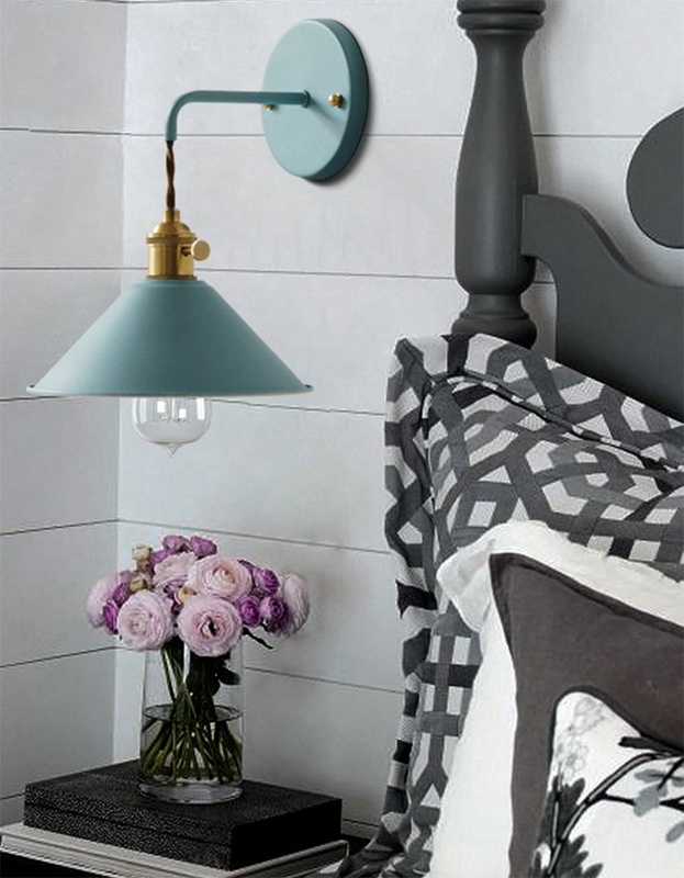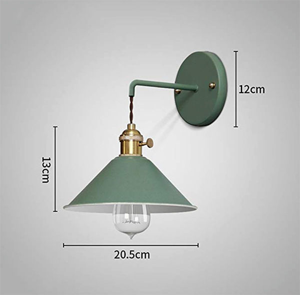 Wandleuchte im nordischen Stil. Wandbasis, Arm und Schirm aus Metall in Farbe pastellgrün. Lampenfassung aus Messing mit Drehschalter für Glühbirnen mit Schraubgewinde E-27. Das Schraubgewinde ist abgehängt durch ein kleines Stück Kabel geflochten mit Textilummantelung in brauner Farbe, höhenverstellbar. Das Innere vom Schirm ist in weißer Farbe um die Beleuchtung zu verbessern.