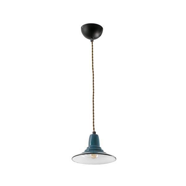 NINETTE ist eine Hängeleuchte im Industriestil mit einem gewissen Retro-Anklang. Ihre Oberfläche in grünlichblauer Farbe versieht sie mit einer perfekten Frische für lässige Zuhause. Textilkabel geflochten, Farbe hellbraun.
