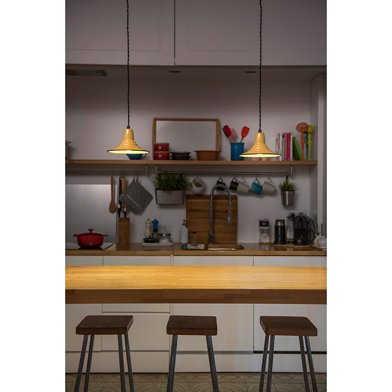 NINETTE ist eine Hängeleuchte im Industriestil mit einem gewissen Retro-Anklang. Ihre Oberfläche in gelber Farbe versieht sie mit einer perfekten Frische für lässige Zuhause. Textilkabel geflochten Farbe