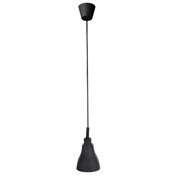 Pendel-Kit zur Verwendung als Deckenleuchte Es besteht aus einer Deckenrosette aus Kunststoff, rundem Kabel mit Textilummantelung, Lampenfassung Standard E-27 und Silikongehäuse. Alles in schwarzer Farbe.