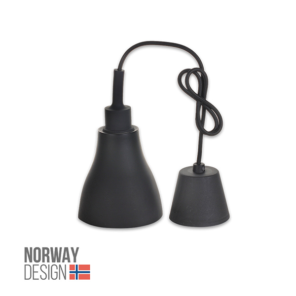 Pendel-Kit zur Verwendung als Deckenleuchte Es besteht aus einer Deckenrosette aus Kunststoff, rundem Kabel mit Textilummantelung, Lampenfassung Standard E-27 und Silikongehäuse. Alles in schwarzer Farbe.
