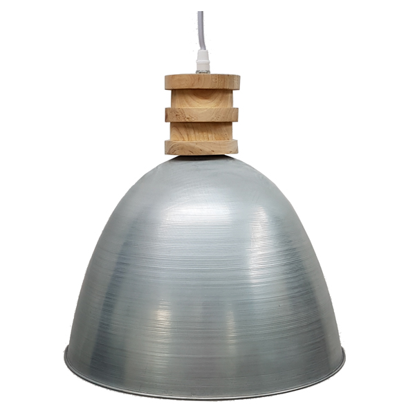 Pendelleuchte Metallschirm in Industrieoptik mit Zierblende aus Holz natur. Deckenrosette Metall Farbe grau. Kabel höhenverstellbar (in weißer Farbe).