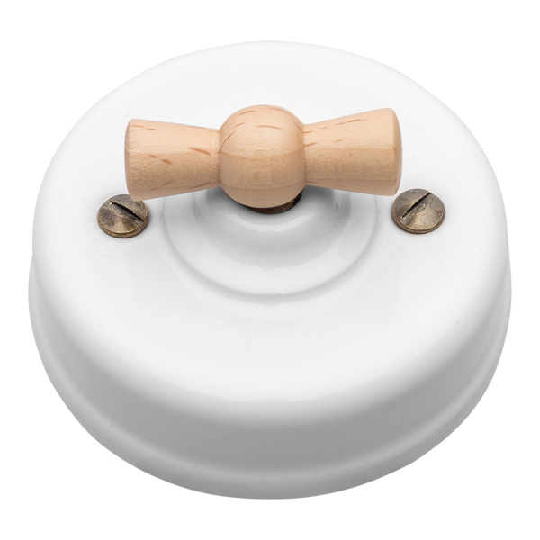 Schalter aus Porzellan mit Schleife aus Buchenholz. Sie machen, dass jede Bewegung um das Licht anzuschalten ein kleines Vergnügen ist.