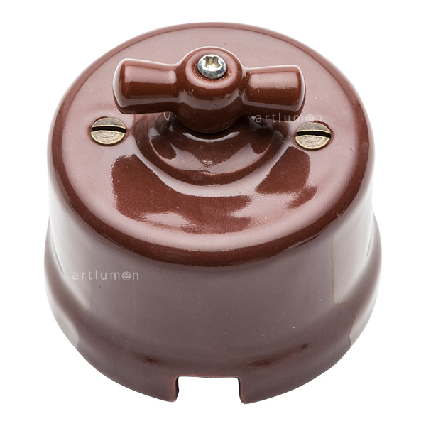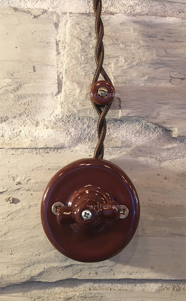 Porzellanschalter mit Drehmechanismus. Originaldesign, Replik der antiken Lichtschalter der ersten elektrischen Installationen Ideal für rustikale Umgebungen oder um Ihrer Einrichtung einen Vintagetouch zu verleihen. Aus-Wechselschalter (erlaubt das kombinierte Einschalten von zwei Punkten aus). Hergestellt aus Porzellan brauner Farbe. Mit Schleife (Griff) aus Porzellan in der gleichen Farbe. Aufputzmontage.