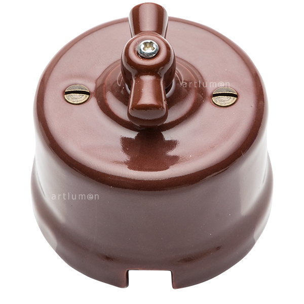 Porzellanschalter mit Drehmechanismus. Originaldesign, Replik der antiken Lichtschalter der ersten elektrischen Installationen Ideal für rustikale Umgebungen oder um Ihrer Einrichtung einen Vintagetouch zu verleihen. Aus-Wechselschalter (erlaubt das kombinierte Einschalten von zwei Punkten aus). Hergestellt aus Porzellan brauner Farbe. Mit Schleife (Griff) aus Porzellan in der gleichen Farbe. Aufputzmontage.