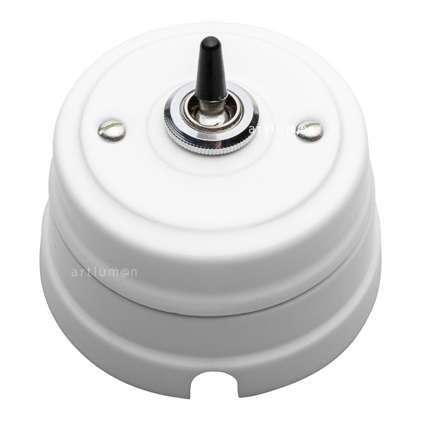 Aus-Wechselschalter mit Hebel, gemeinhin als „Kippschalter“ bezeichnet. Der Schalter ist elegant in das Porzellan integriert, vollendet mit einer Metallringblende. Lassen sich perfekt mit unseren Steckdosen aus Porzellan aus der gleichen Serie kombinieren.