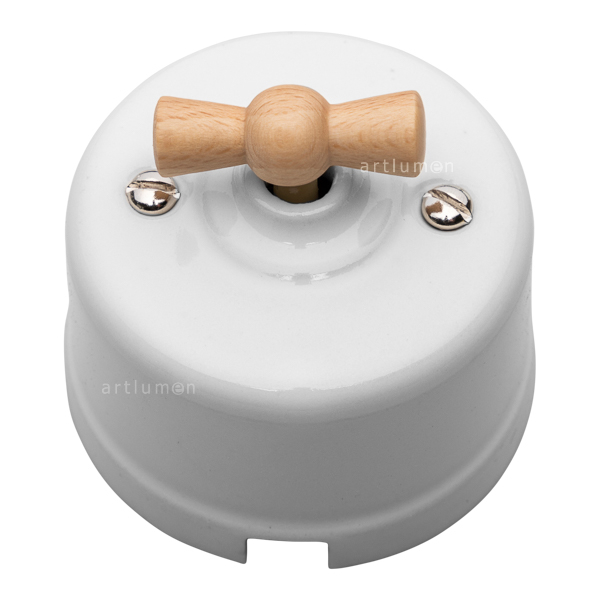 Porzellanschalter mit Drehmechanismus. Originaldesign, Replik der antiken Lichtschalter der ersten elektrischen Installationen Ideal für rustikale Umgebungen oder um Ihrer Einrichtung einen Vintagetouch zu verleihen. Aus-Wechselschalter (erlaubt das kombinierte Einschalten von zwei Punkten aus). Hergestellt aus Porzellan weiß. Mit Schleife (Griff) aus Buchenholz natur. Aufputzmontage.