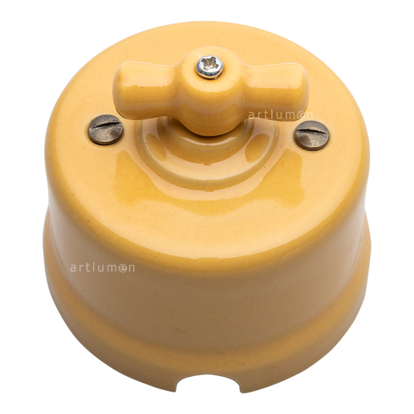 Schalter mit Drehmechanismus. Hergestellt aus Porzellan der Farbe senfgelb. Originaldesign, Replik der antiken Lichtschalter der ersten elektrischen Installationen Ideal für rustikale Umgebungen oder um Ihrer Einrichtung einen Vintagetouch zu verleihen. Aus-Wechselschalter (erlaubt das kombinierte Einschalten von zwei Punkten aus). Hergestellt aus Porzellan. Mit Schleife (Griff) aus Porzellan. Auch erhältlich in anderen Farben. Aufputzmontage. Abmessungen: Durchmesser=64mm. Höhe=59mm. Schalter sind nach gültigen europäischen Sicherheitsnormen geprüft und zertifiziert. 10A 250V. Schrauben und Dübel inbegriffen.