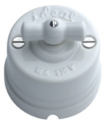 Porzellanschalter mit Drehmechanismus. Originales Design, Replik des antiken Schalters der ersten elektrischen Installationen. Ideal für rustikale Umgebungen oder um Ihrer Einrichtung einen Vintagetouch zu geben. Aus-Wechselschalter (erlaubt das kombinierte Einschalten von zwei Punkten aus). Hergestellt aus Porzellan. Mit Schleife (Griff) aus Porzellan. Auch erhältlich mit Schleife aus Holz. Aufputzmontage. Abmessungen: Durchmesser=55mm. Höhe=56mm. Schalter sind nach gültigen europäischen Sicherheitsnormen geprüft und zertifiziert. 10A 250V. Schrauben in Edelstahl und Dübel eingeschlossen.