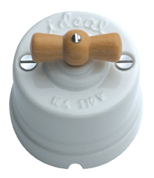 Porzellanschalter mit Drehmechanismus. Originaldesign, Replik der antiken Lichtschalter der ersten elektrischen Installationen. Erinnern an rustikale Umgebungen, geben Ihrer Einrichtung einen Vintagetouch. Aus-Wechselschalter (erlaubt das kombinierte Einschalten von zwei Punkten aus). Hergestellt aus Porzellan mit Schleife (Griff) aus Holz Oberfläche Buche (hell).
