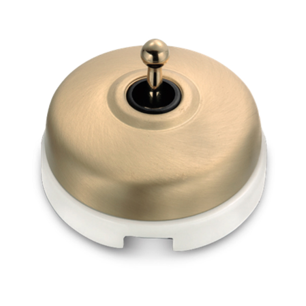 Schalter Dimbler (Typ Kippschalter) mit Basis aus weißem Porzellan und Zierblende aus goldfarbenem, glänzenden Messing.