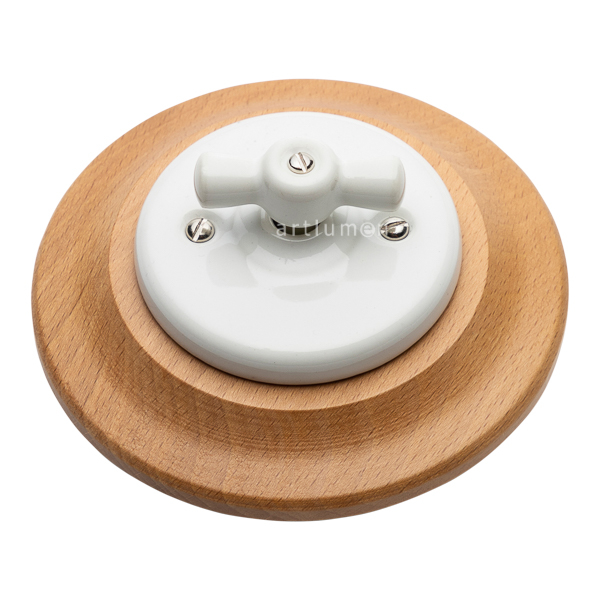 Aus-Wechselschalter hergestellt aus weißem Porzellan mit Rahmen aus hellem Holz für Unterputzmontage. Klassische Schalter aus Porzellan auf Rahmen aus Buchenholz gebeizt Oberfläche natur. Sein frischer Stil integriert sich perfekt in Einrichtungen im mediterranen Stil.