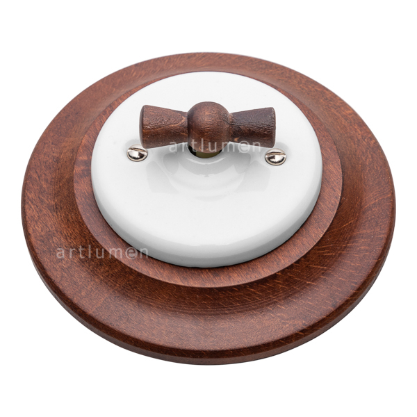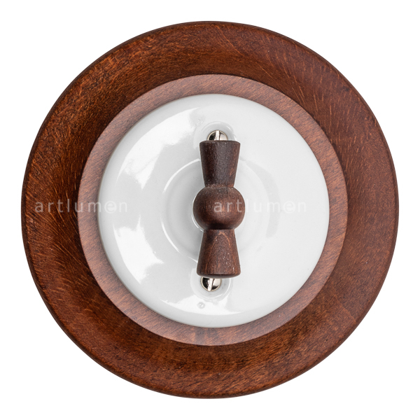 Aus-Wechselschalter hergestellt aus weißem Porzellan mit Schleife (Griff) aus Buchenholz natur gebeizt Farbe kastanienbraun dunkel. Rahmen aus dunklem Holz für Unterputzmontage.