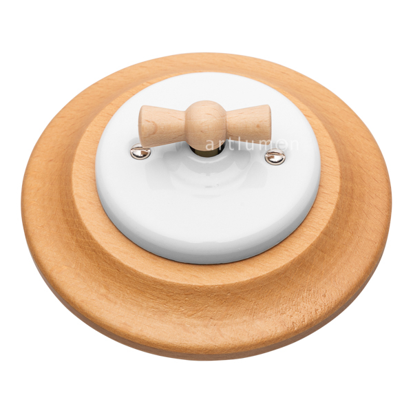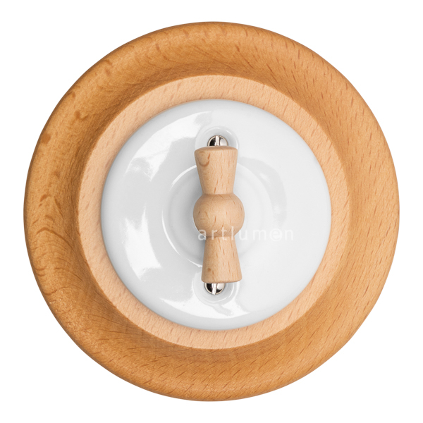Aus-Wechselschalter hergestellt aus weißem Porzellan mit Schleife (Griff) aus Buchenholz natur. Rahmen aus hellem Holz für Unterputzmontage. Klassische Schalter aus Porzellan auf Rahmen aus Buchenholz gebeizt Oberfläche natur. Sein frischer Stil integriert sich perfekt in Einrichtungen im mediterranen Stil.