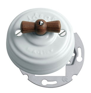 Porzellanschalter mit Drehmechanismus. Originaldesign, Replik der antiken Lichtschalter der ersten elektrischen Installationen Ideal für rustikale Umgebungen oder um Ihrer Einrichtung einen Vintagetouch zu verleihen. Aus-Wechselschalter (erlaubt das kombinierte Einschalten von zwei Punkten aus). Hergestellt aus Porzellan. Mit Schleife (Griff) aus Holz Oberfläche Bubinga