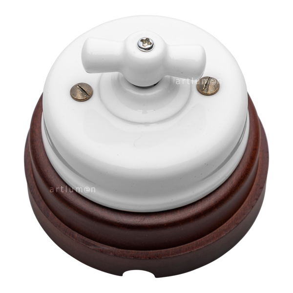 Original Drehschalter aus weißem Porzellan mit Basis aus Buchenholz gebeizt in Farbe kastanienbraun.