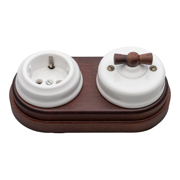 Die Basis aus Holz und die Schleife (Griff) des Schalters sind aus Buche gebeizt in dunkler kastanienbrauner Farbe.