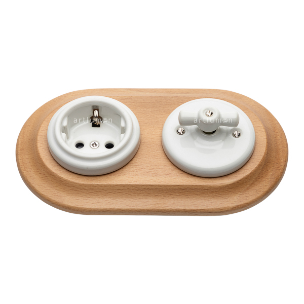 Set bestehend aus Schalter und Stecksockel aus weißem Porzellan und doppelt hellem Holzrahmen. Für den Einbau.