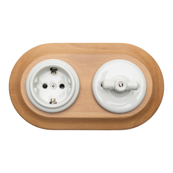 Set bestehend aus Schalter und Stecksockel aus weißem Porzellan und doppelt hellem Holzrahmen. Für den Einbau.