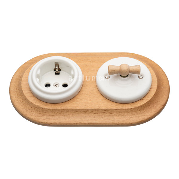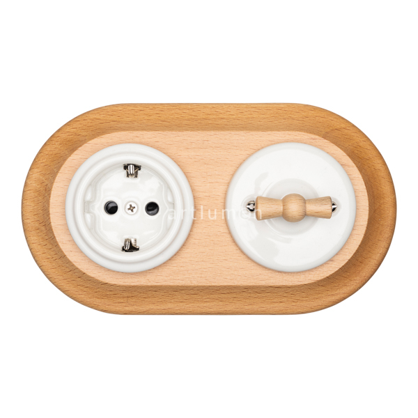 Set bestehend aus Aus-Wechselschalter und Steckdose, hergestellt aus Porzellan weiß und Doppelrahmen Holz hell.
