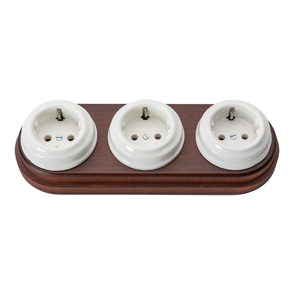 Set aus drei Porzellansteckdosen auf einem Dreifachrahmen aus dunklem Holz (Ton kastanienbraun), der die Eleganz des weißen Porzellan kontrastiert. Rahmen aus Buchenholz, handbearbeitet, mit klassischen und schlichten Linien. Die Beschaffenheit des Sets kreiert eine schlichte und elegante Zusammenstellung.