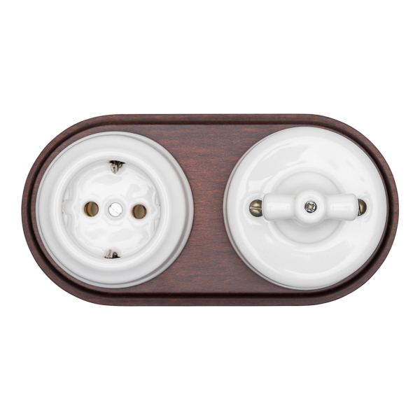 Set aus einem Schalter und einer Steckdose aus Porzellan auf Doppelrahmen aus Holz. In dieser Komposition sticht das Holz heraus, das das Set umgibt. Schalterzusammenstellung sehr üblich in den Schlafzimmern. Schalter und Steckdose sind angeordnet auf Holz natur, das dem Set eine große persönliche Note und Kraft verleiht. Das Werk aus handbearbeitetem Holz bringt das weiße Porzellan zur Geltung, und erschafft so eine Einheit aus Schalter und Steckdose, die nicht übersehen wird. Buchenholz, gebeizt in dunkler kastanienbrauner Farbe
