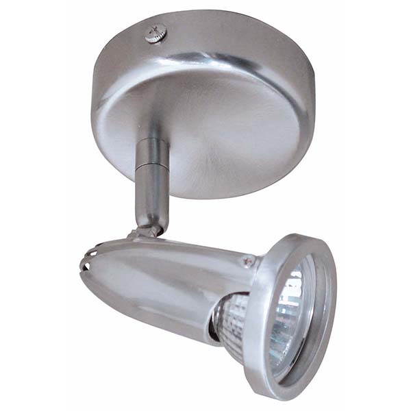 Leuchte mit einem Metall-Punktstrahler. Oberfläche chrom matt. Vollständig ausrichtbar. Zur Montage an Wand oder Decke. Lampenfassung GU-10. Für Halogenleuchten und LED.