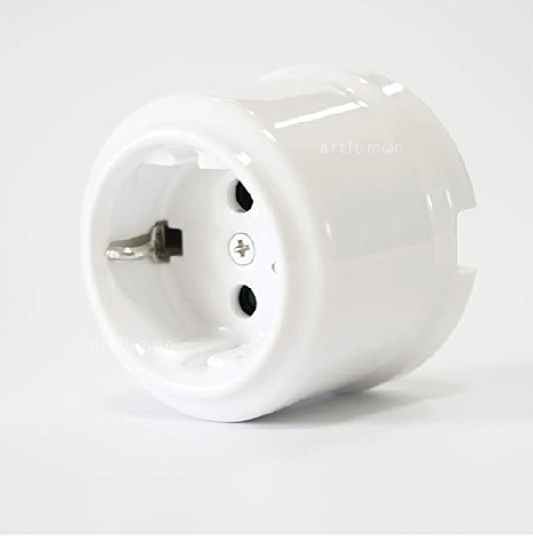 Originaldesign, Replik der antiken Porzellansteckdosen aber sie erfüllen dabei die aktuellen Sicherheitsnormen. Erinnern an rustikale Ambiente. Passen perfekt zu Retroinstallationen. Für alle Arten von Netzsteckern (fein und dick mit PE) Aufputzmontage. Hergestellt aus Porzellan.