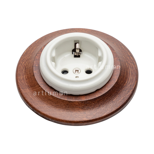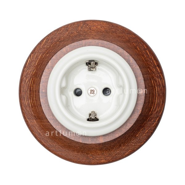 Steckdosenbasis hergestellt aus weißem Porzellan mit Rahmen aus dunklem Holz für Unterputzmontage. Klassische Schalter aus Porzellan auf Rahmen aus Buchenholz gebeizt Farbe kastanienbraun dunkel . Geschmackvolle Designs, die uns in rustikale Ambiente versetzen.