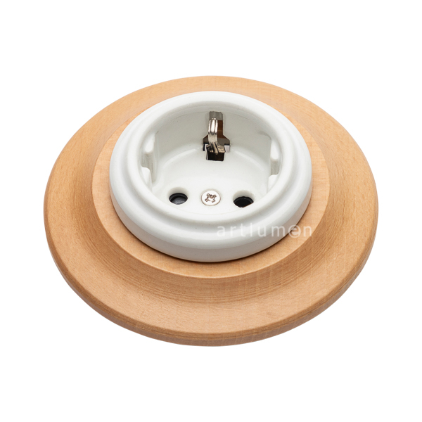 Steckdosenbasis hergestellt aus weißem Porzellan mit Rahmen aus hellem Holz für Unterputzmontage. Klassische Schalter aus Porzellan auf Rahmen aus Buchenholz gebeizt Oberfläche natur. Sein frischer Stil integriert sich perfekt in Einrichtungen im mediterranen Stil.