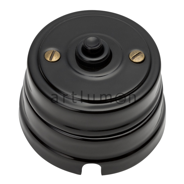 Klingel-Tastschalter aus Porzellan und Messing glänzend mit Basis aus Holz