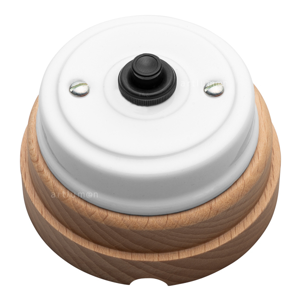 Klingel -Tastschalter hergestellt aus weißem Porzellan mit Knopf in Farbe Schwarz. Montiert auf einer Basis aus Buchenholz gebeizt Oberfläche natur. Holzrahmen von Hand bearbeitet. Sein Design in klassischen und schlichten Linien heben das Porzellan, mit dem sie kombiniert werden, hervor. Originaldesign, an die antiken Schalter erinnernd. Ideal für rustikale und klassische Umgebungen.