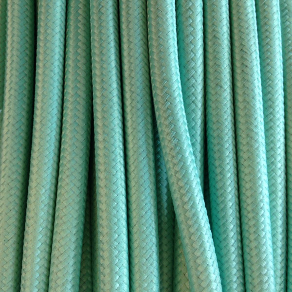 Rundes Stromkabel mit Textilummantelung in aquagrüner Farbe. Die Farbe aquagrün oder aquamarin ist eine Mischung aus Grün und Blau, so erhält man eine klare, fast transparente Farbe. Es ist eine Farbe, die mehrere Eigenschaften mit sich bringt, welche sie aus allen natürlichen Farbtönen, die wir kennen, hervorheben, darunter finden wir Frische, Ruhe, Gelassenheit und Jugendlichkeit.