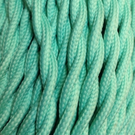Rundes Stromkabel mit Textilummantelung in aquagrüner Farbe. Die Farbe aquagrün oder aquamarin ist eine Mischung aus Grün und Blau, so erhält man eine klare, fast transparente Farbe. Es ist eine Farbe, die mehrere Eigenschaften mit sich bringt, welche sie aus allen natürlichen Farbtönen, die wir kennen, hervorheben, darunter finden wir Frische, Ruhe, Gelassenheit und Jugendlichkeit.