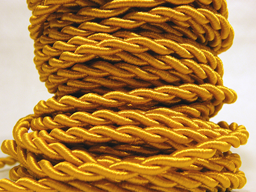 Textilkabel geflochten, Farbe GOLD. Es handelt sich um ein sehr originelles Textilkabel, da die Oberfläche einen Farbeffekt Seide hat. Glänzende und einheitliche Farben. Ideal für Lampen und um Installationen in eleganter und moderner Optik zu realisieren.