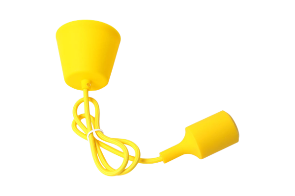 Hängeleuchte mit textilummanteltem Kabel in gelber Farbe. Kunststoffrosette, Textilkabel und Lampenfassung mit Silikongehäuse, alles passend in der gleichen Farbe.
