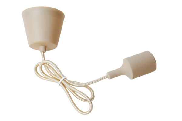 Es handelt sich um eine Hängeleuchte mit textilummanteltem Kabel in goldener Farbe. Kunststoffrosette, Textilkabel und Lampenfassung mit Silikongehäuse, alles passend in der gleichen Farbe.