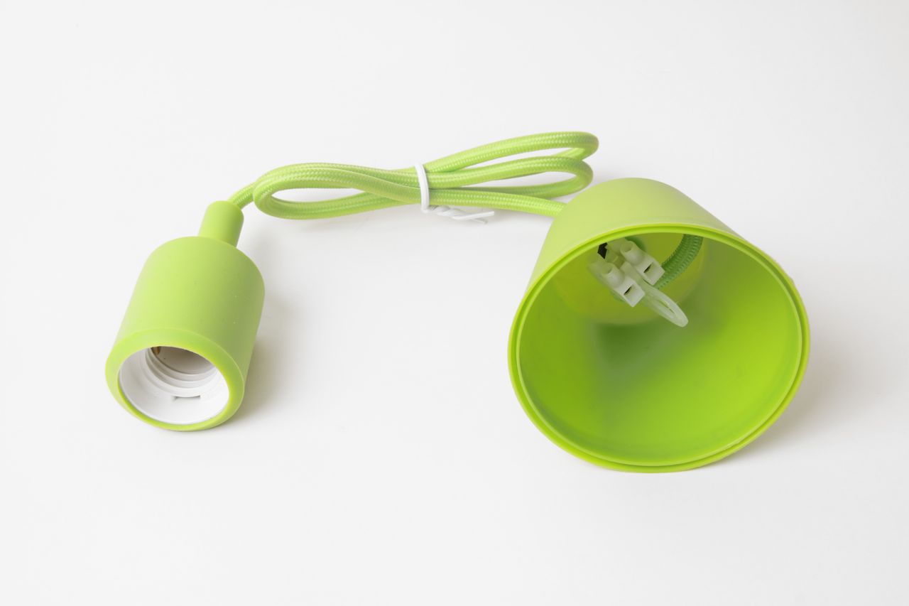 Hängeleuchte mit textilummanteltem Kabel in grüner Farbe. Kunststoffrosette, Textilkabel und Lampenfassung mit Silikongehäuse, alles passend in der gleichen Farbe.