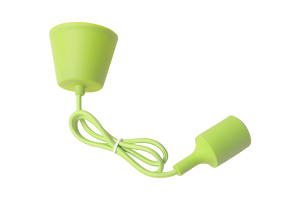 Hängeleuchte mit textilummanteltem Kabel in grüner Farbe. Kunststoffrosette, Textilkabel und Lampenfassung mit Silikongehäuse, alles passend in der gleichen Farbe.