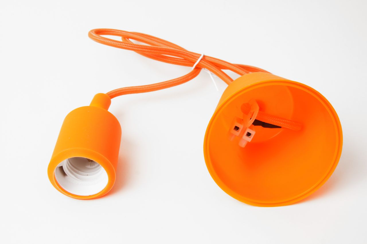 Hängeleuchte mit textilummanteltem Kabel in oranger Farbe. Kunststoffrosette, Textilkabel und Lampenfassung mit Silikongehäuse, alles passend in der gleichen Farbe.