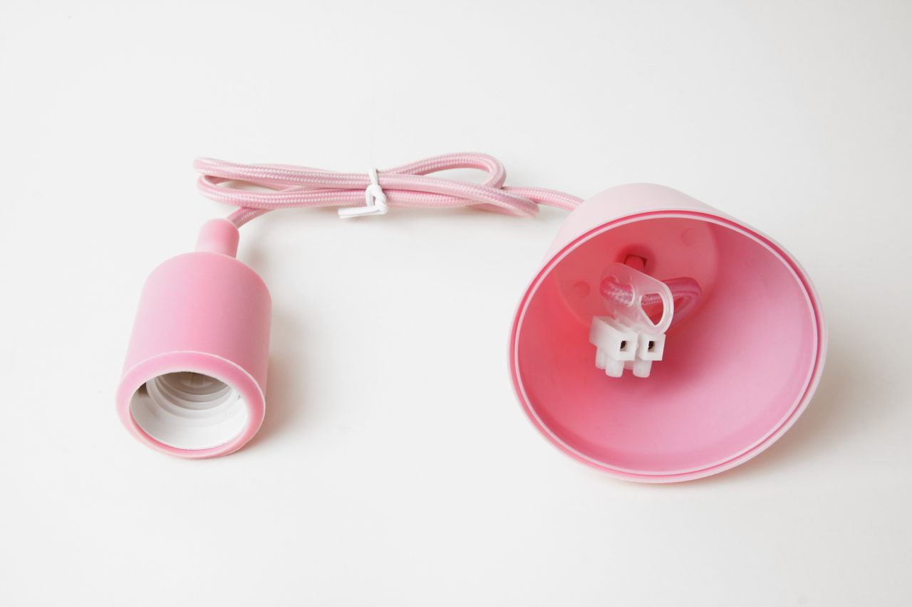 Hängeleuchte mit textilummanteltem Kabel in rosa Farbe. Kunststoffrosette, Textilkabel und Lampenfassung mit Silikongehäuse, alles passend in der gleichen Farbe.
