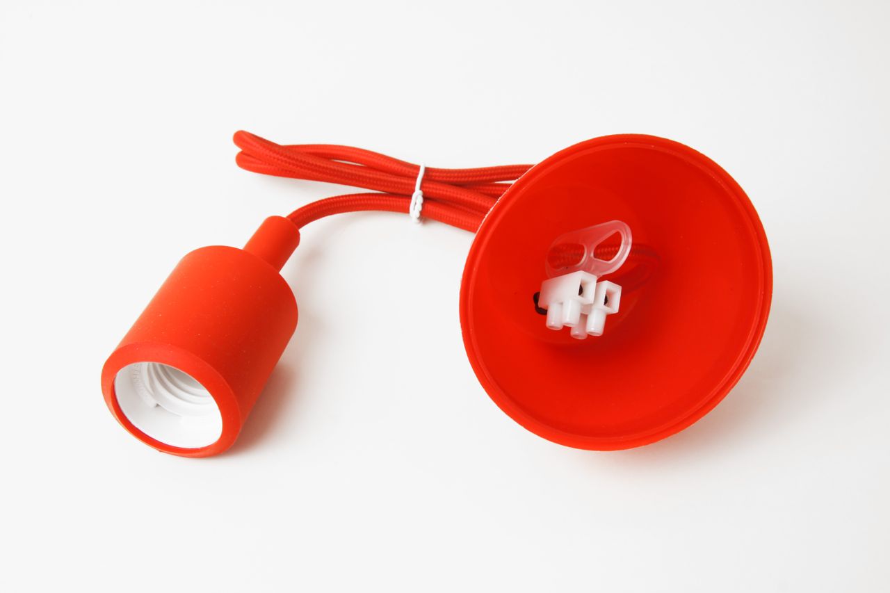 Hängeleuchte mit textilummanteltem Kabel in roter Farbe. Kunststoffrosette, Textilkabel und Lampenfassung mit Silikongehäuse, alles passend in der gleichen Farbe.