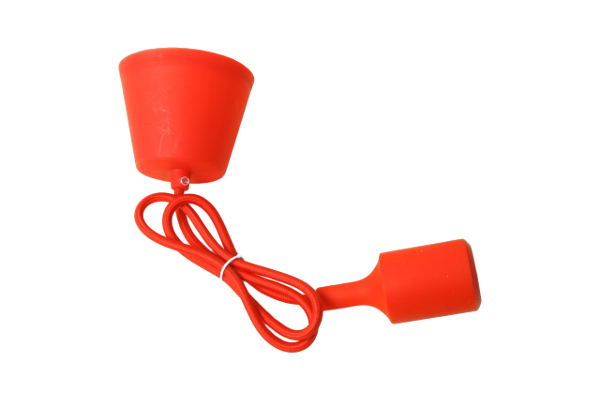 Hängeleuchte mit textilummanteltem Kabel in roter Farbe. Kunststoffrosette, Textilkabel und Lampenfassung mit Silikongehäuse, alles passend in der gleichen Farbe.