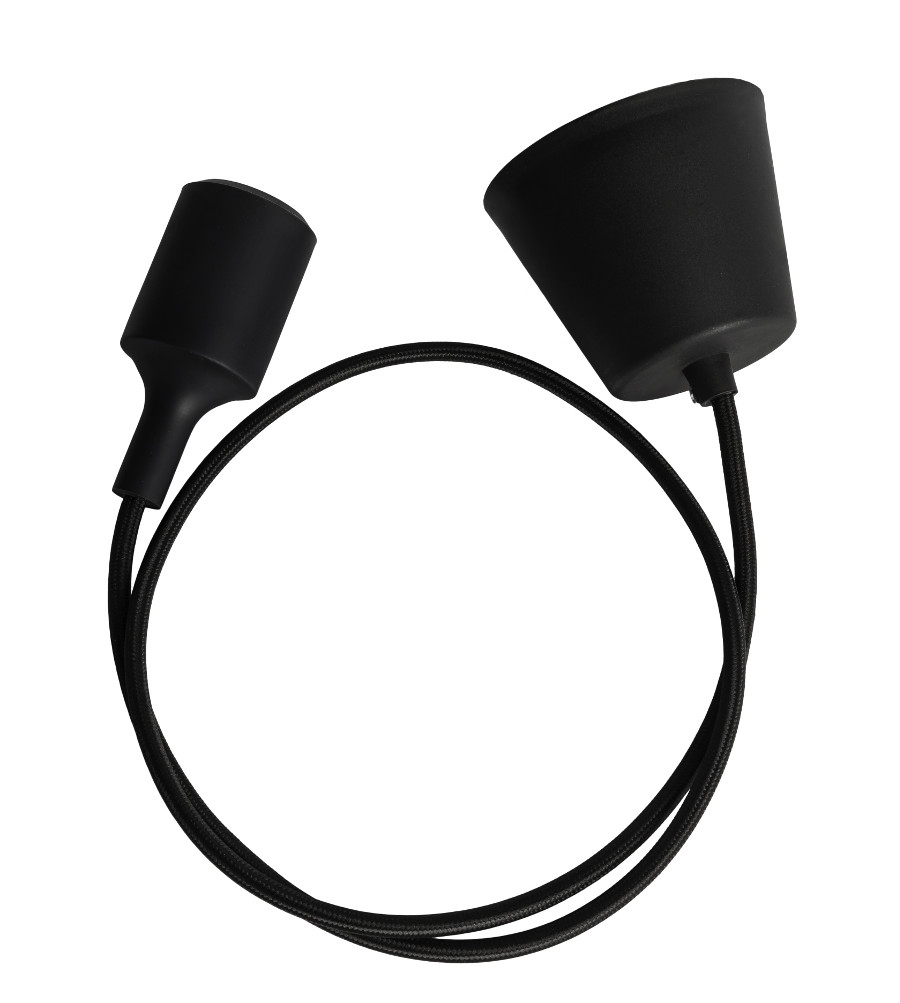 Hängeleuchte mit textilummanteltem Kabel in schwarzer Farbe. Kunststoffrosette, Textilkabel und Lampenfassung mit Silikongehäuse, alles passend in der gleichen Farbe.