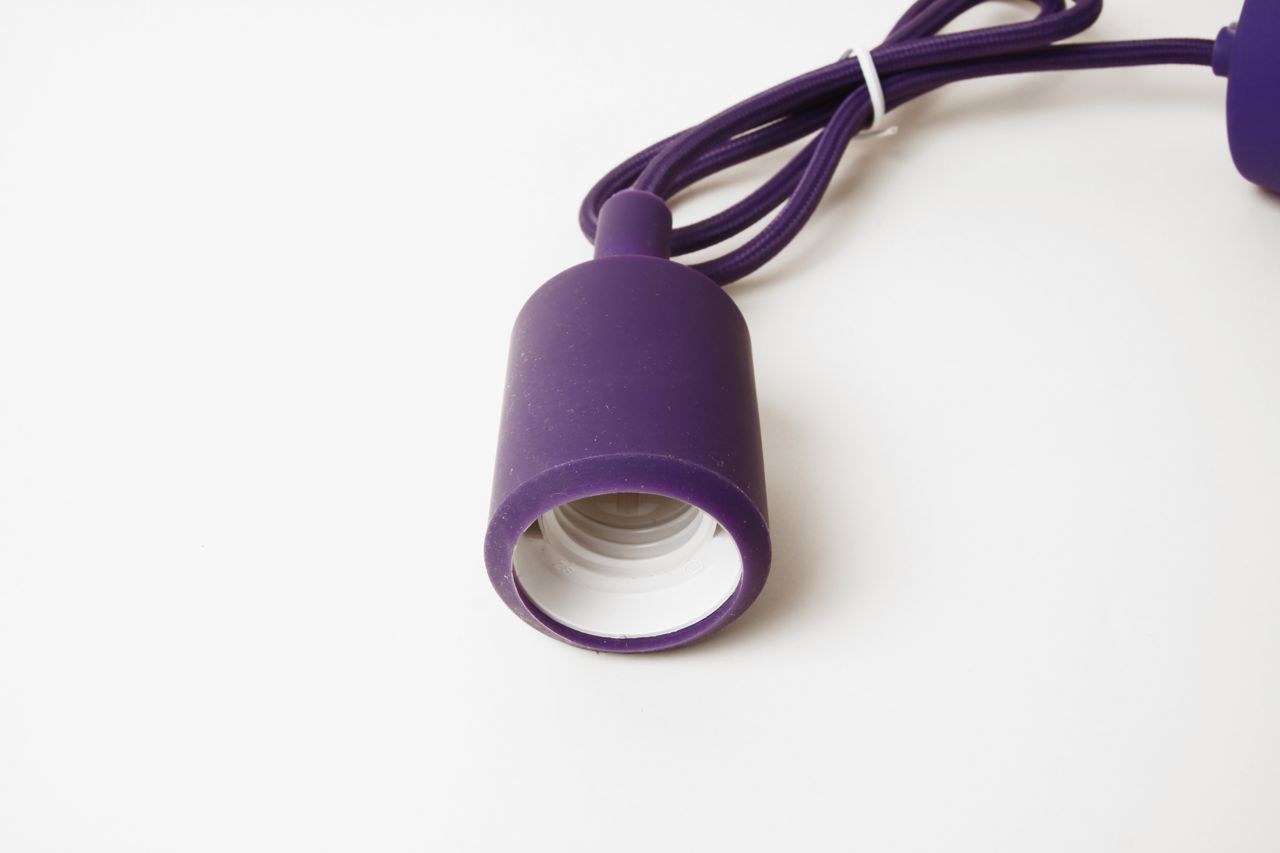 Hängeleuchte mit textilummanteltem Kabel in violetter Farbe. Kunststoffrosette, Textilkabel und Lampenfassung mit Silikongehäuse, alles passend in der gleichen Farbe.